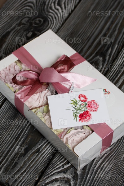 Домашний зефир в подарочной упаковке. Перевязан лентой. Зефир цветы. Домашняя открытка в белом цвете. С декоративными элементами. На картон крепятся ленты, цветы и листья. На черных сосновых досках