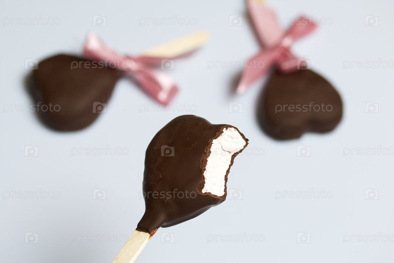 Зефир в шоколаде на палочке. Один кусок. зефирные сердечки, глазированные шоколадом. На белом фоне