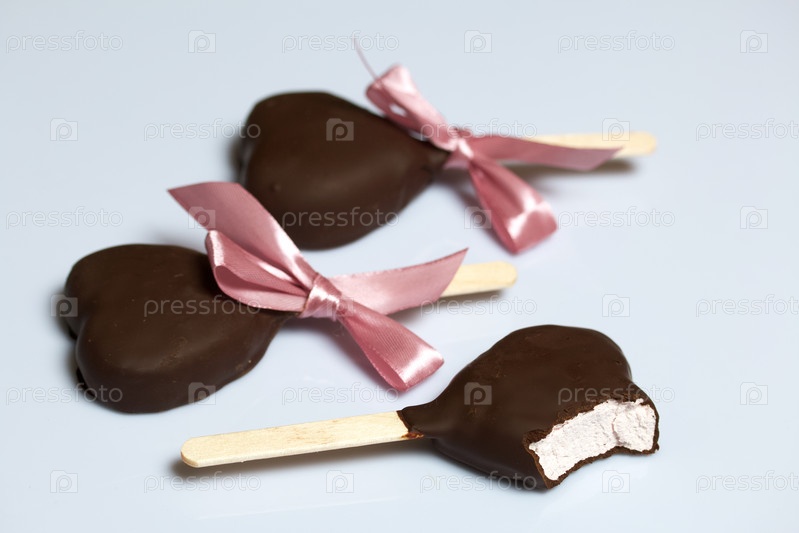 Зефир в шоколаде на палочке. Один кусок. зефирные сердечки, глазированные шоколадом. Они лежат на белой поверхности