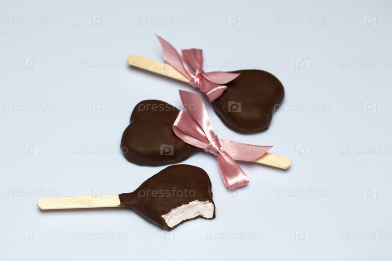 Зефир в шоколаде на палочке. Один кусок. зефирные сердечки, глазированные шоколадом. Они лежат на белой поверхности