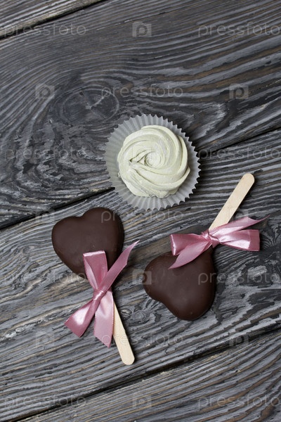 Зефир в шоколаде на палочке. Зефирные сердечки, глазированные шоколадом. Они лежат на сосновых досках. Снято сверху, крупным планом
