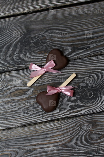 Зефир в шоколаде на палочке. Зефирные сердечки, глазированные шоколадом. Они лежат на сосновых досках. Снято сверху, крупным планом