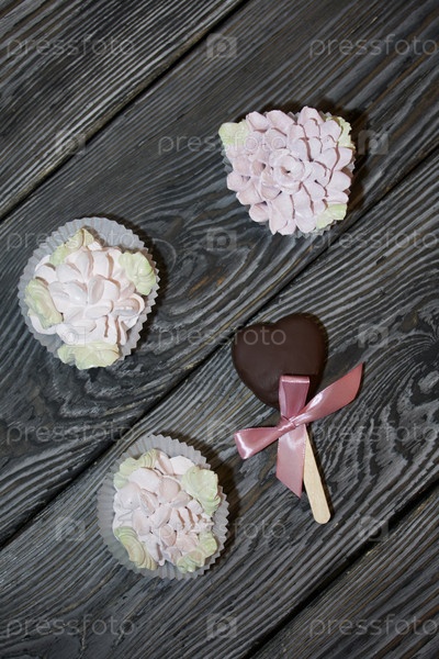 Зефир в шоколаде на палочке. Зефирные сердечки, глазированные шоколадом. Они лежат на сосновых досках. Снято сверху, крупным планом