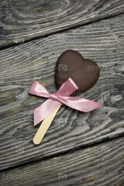 Зефир в шоколаде на палочке. Зефирные сердечки, глазированные шоколадом. Они лежат на сосновых досках. Снято сверху, крупным планом