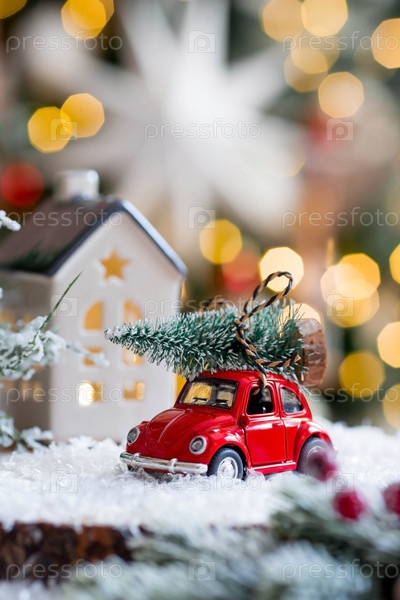Рождественский красный ретро-автомобиль везет на крыше елку с красивым боке. Концепция доставки товаров и поздравительная открытка с Новым годом