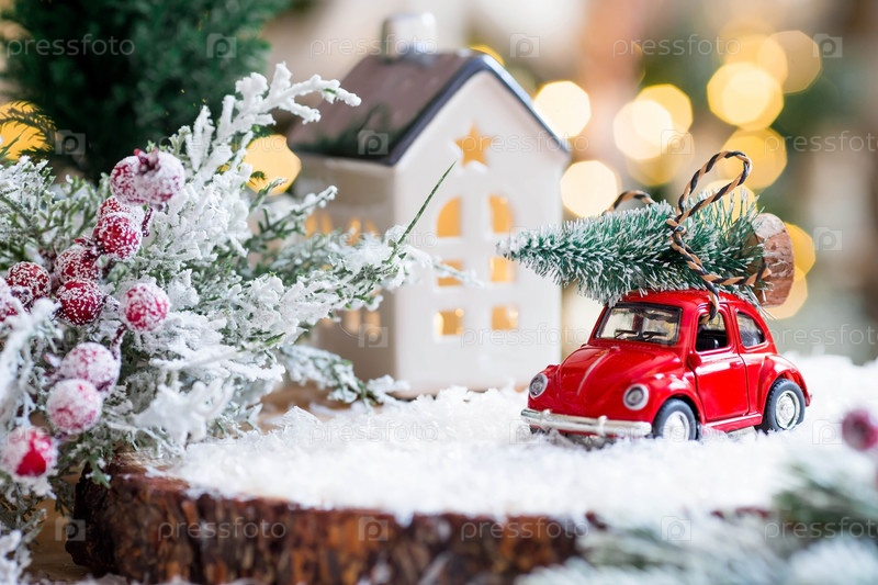 Рождественский красный ретро-автомобиль везет на крыше елку с красивым боке. Концепция доставки товаров и поздравительная открытка с Новым годом