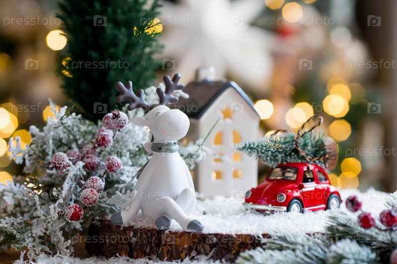 Рождественский красный ретро-автомобиль везет на крыше елку с красивым боке. Концепция доставки товаров и поздравительная открытка с Новым годом