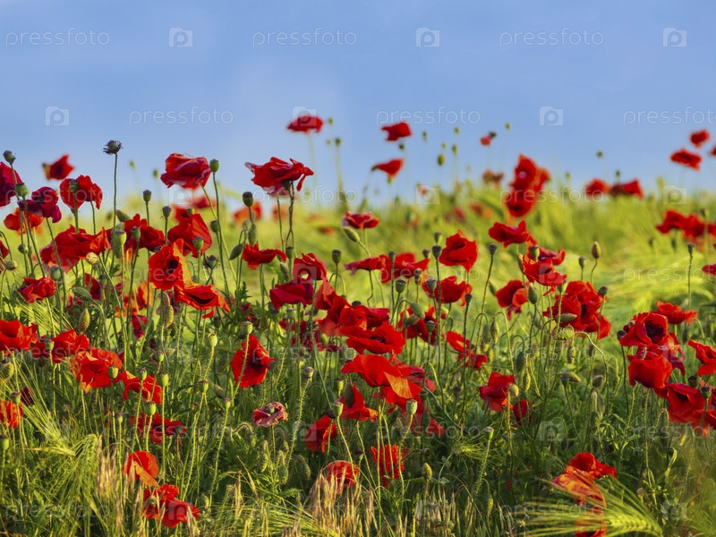 Много красных маков в зеленом поле на солнце в летний закатный день, размытый фон, свободное место для текста. Дикие красные летние маки в пшеничном поле