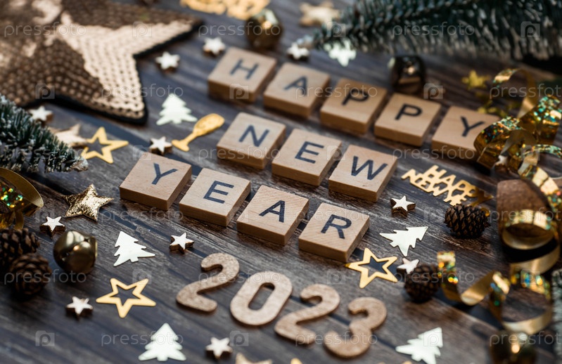 Баннер. Символ числа 2023 с золотыми шарами, звездами, блестками и елкой на деревянном фоне. Концепция празднования Нового 2023 года и Рождества
