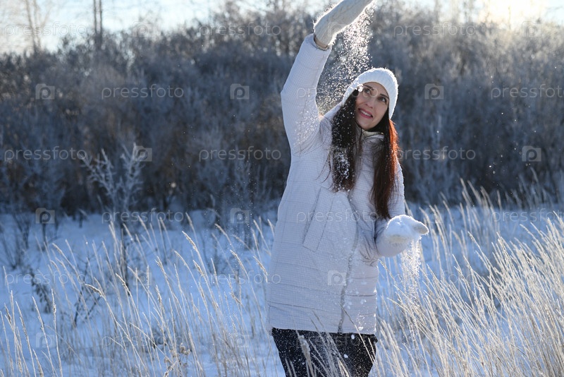 Красивая женщина с длинными волосами в модной зимней одежде (белый пуховик, вязаная стильная шапка, варежки, валенки) на улице. Ловля снега. зимняя сказка