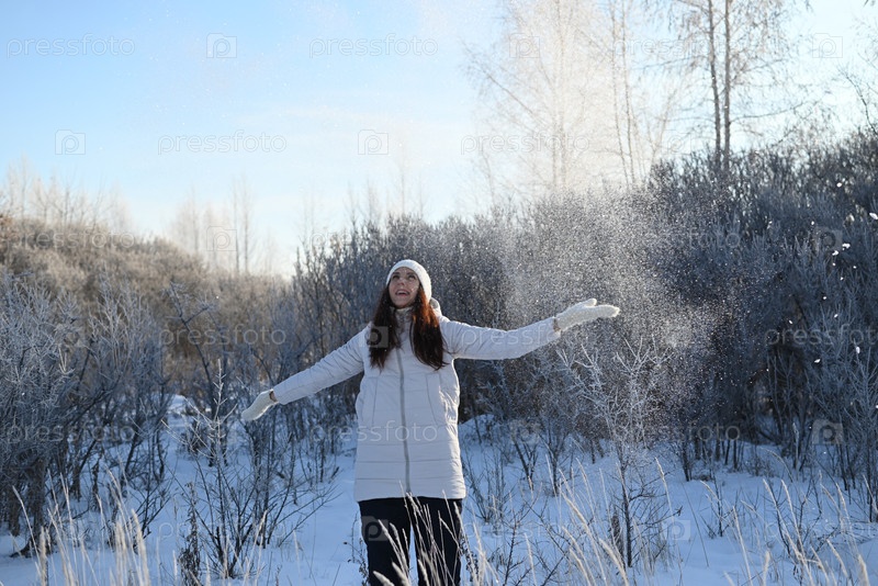 Красивая женщина с длинными волосами в модной зимней одежде (белый пуховик, вязаная стильная шапка, варежки, валенки) на улице. Ловля снега. зимняя сказка