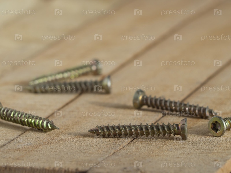 Саморезы на деревянном фоне. Хромированные стальные или металлические винты на деревянных досках, малая глубина резкости