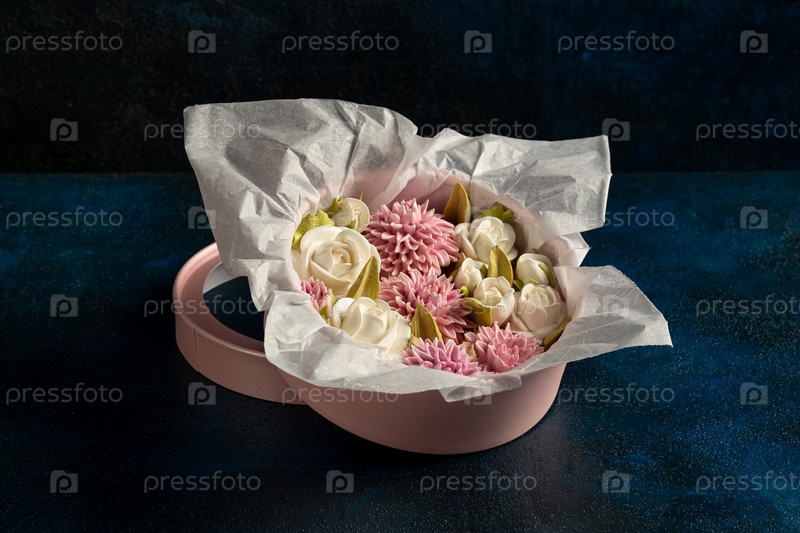 Зефирный букет цветов в подарочной коробке на синем фоне, праздничное настроение, День святого Валентина, Международный женский день