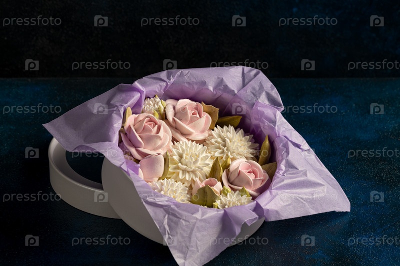 Зефирный букет цветов в подарочной коробке на синем фоне, праздничное настроение, День святого Валентина, Международный женский день