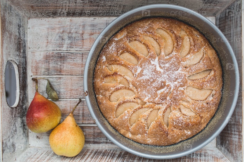 Классический кондитерский десерт. Концепция приготовления пищи. Домашний грушевый пирог и свежие фрукты на деревенском деревянном фоне, вид сверху, место для копирования