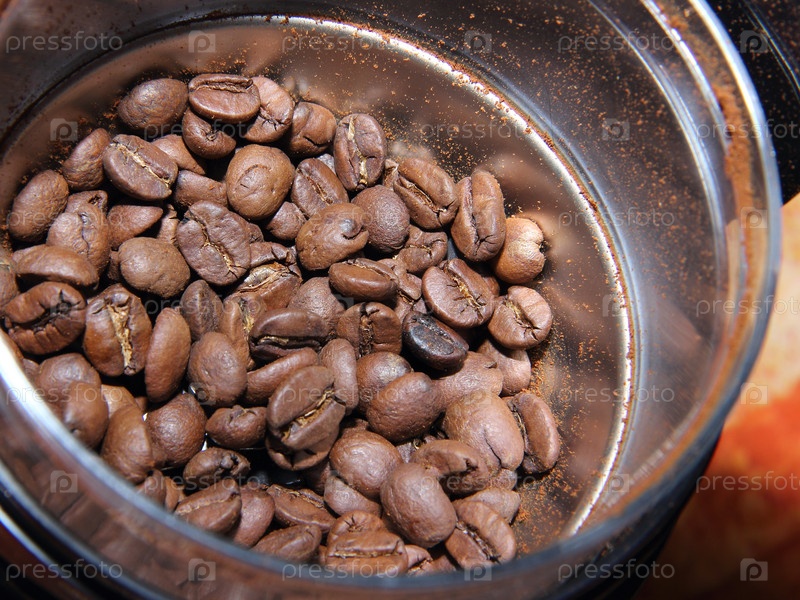 Натуральные кофейные зерна в россыпи в кофемолке перед помолом
