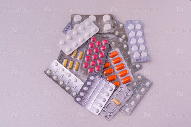 Различные таблетки в упаковках лежат на столе