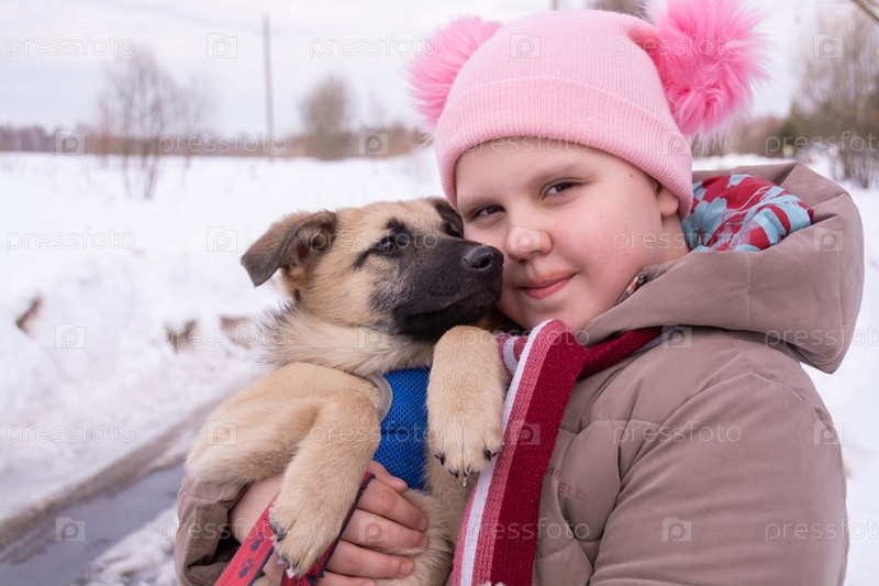 В морозный зимний день девочка идет по улице с красивым маленьким щенком