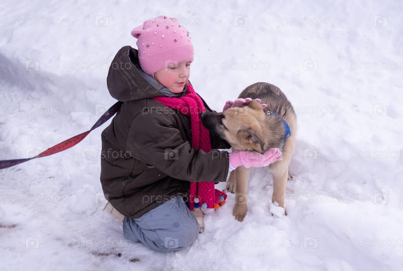 В морозный зимний день девочка идет по улице с красивым маленьким щенком