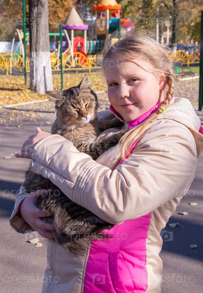Осенью на улице девушка держит в руках красивого бездомного кота