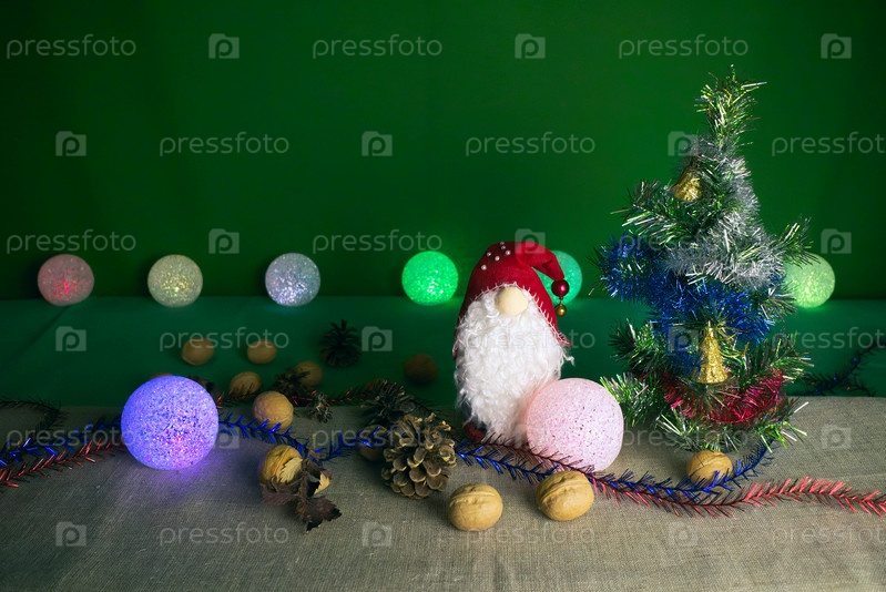 Игрушка Санта-Клауса возле елки вокруг ярких цветных шаров. Рождественское украшение на столе с множеством орехов и сосновых шишек