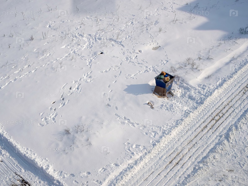 Мусорный контейнер у дороги на заснеженной земле зимой, вид сверху