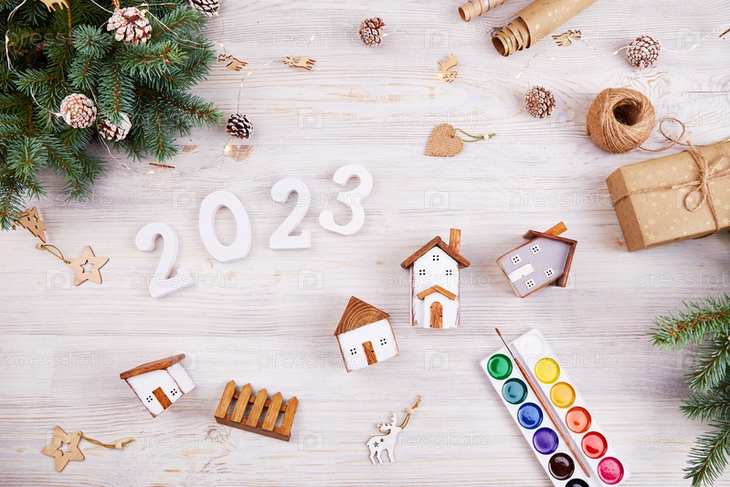 Самодельные деревянные домики, белые цифры 2023, еловые ветки