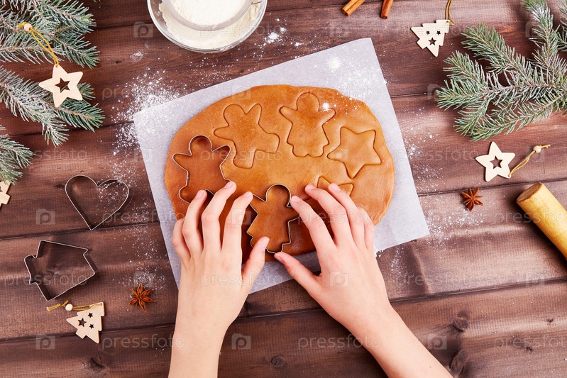 Женские руки раскатывают тесто и делают пряники с формами