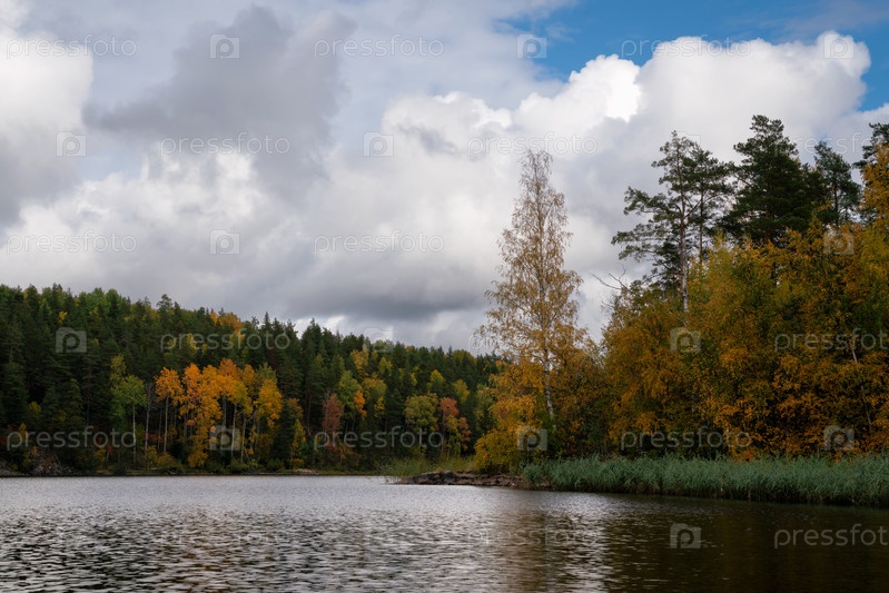 Вид на Ладожское озеро у поселка Лумиваара в солнечный осенний день, Ладожские шхеры, Республика Карелия, Россия
