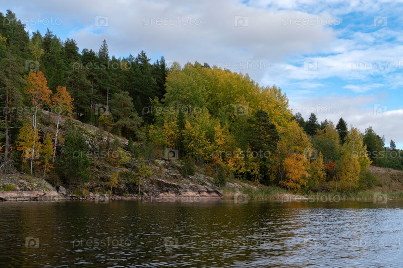 Вид на Ладожское озеро у поселка Лумиваара в солнечный осенний день, Ладожские шхеры, Республика Карелия, Россия