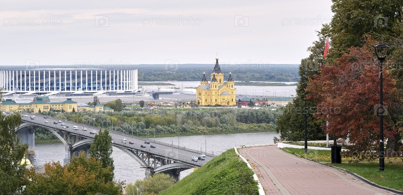 Вид на Стрелку с собором Александра Невского и стадионом, Канавинский мост с набережной Федоровского. Осень. Аллея дружбы. Нижний Новгород