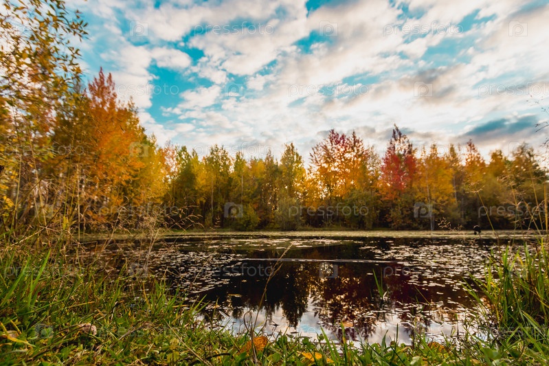 Лесной пруд, покрытый разноцветными опавшими листьями