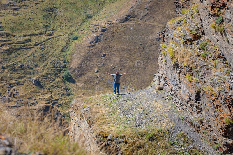 Мужчина в горах с распростертыми объятиями смотрит в камеру
