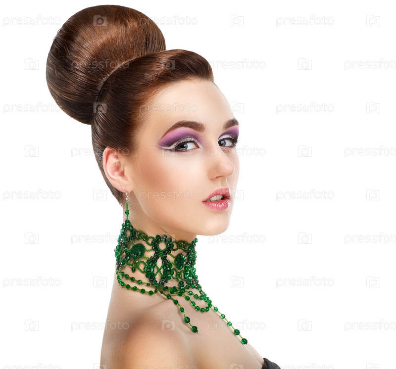 Стильная женщина с зелеными драгоценными камнями на шее