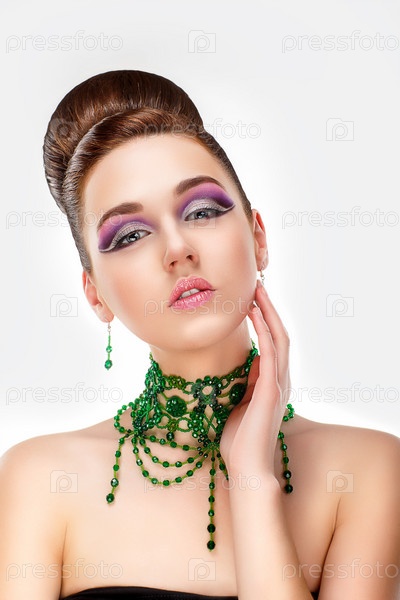 Стильная женщина с зелеными драгоценными камнями на шее