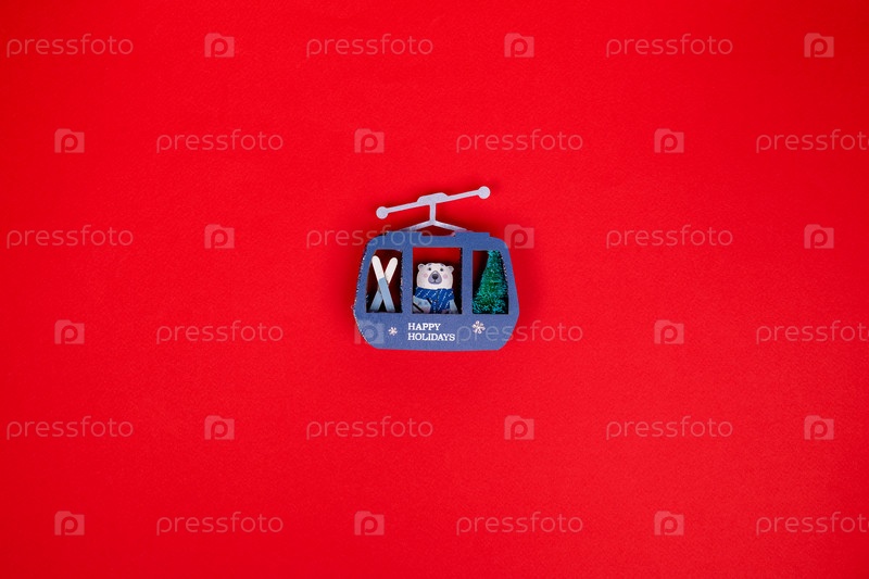 Рождественская игрушка, медведь в домике на красном фоне. Новогодний креатив. баннер, открытка с местом для текста