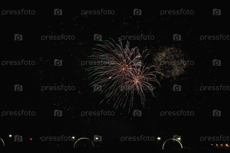 Разноцветный фейерверк в темном небе, празднование дня города