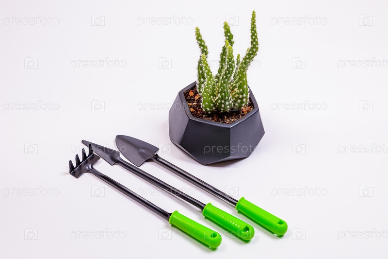 Садовые инструменты с цветком кактуса на белом фоне