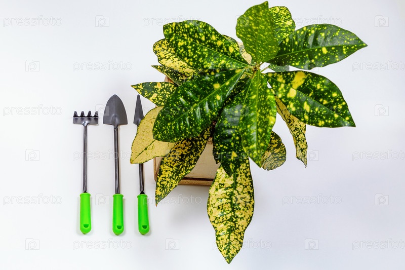 Садовые инструменты с пышным цветком в горшке на белом фоне