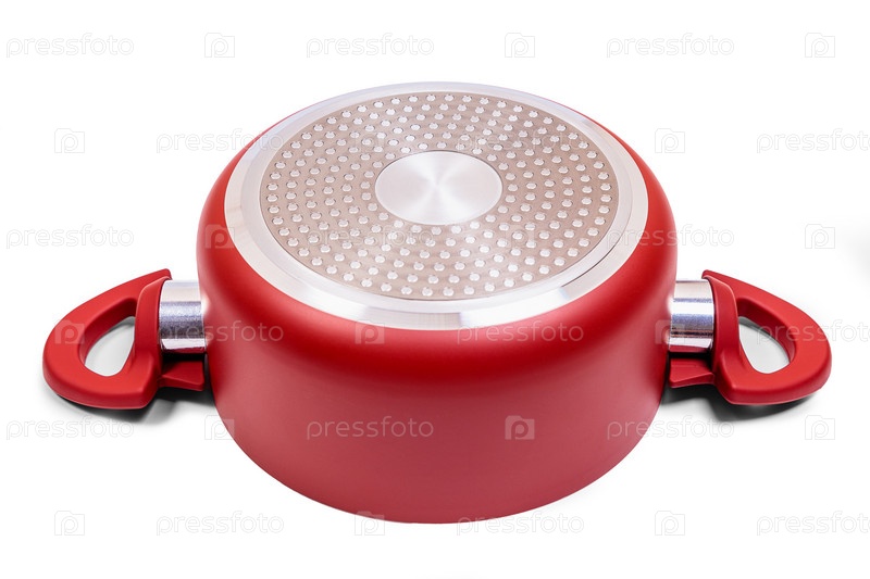 Современная красная сковорода с антипригарным покрытием на белом фоне
