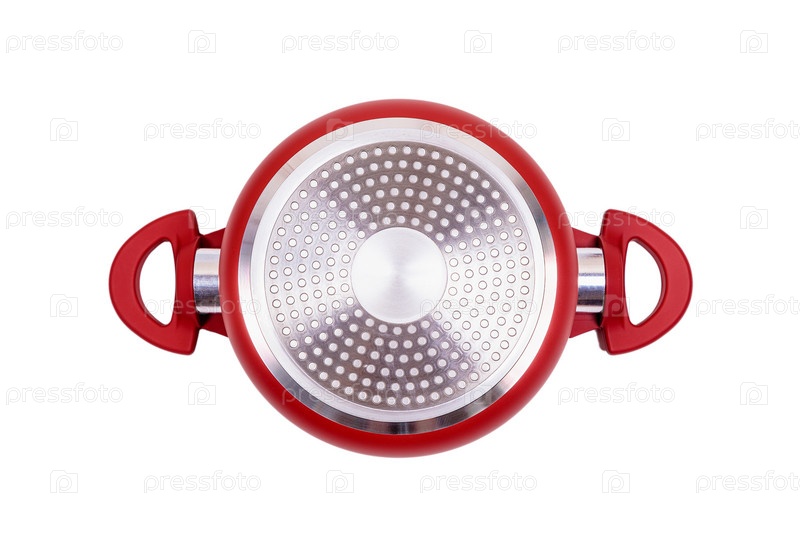 Современная красная сковорода с антипригарным покрытием на белом фоне