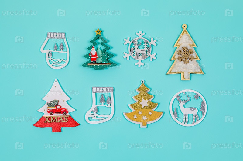Рождественские игрушки, елочные украшения на синем фоне