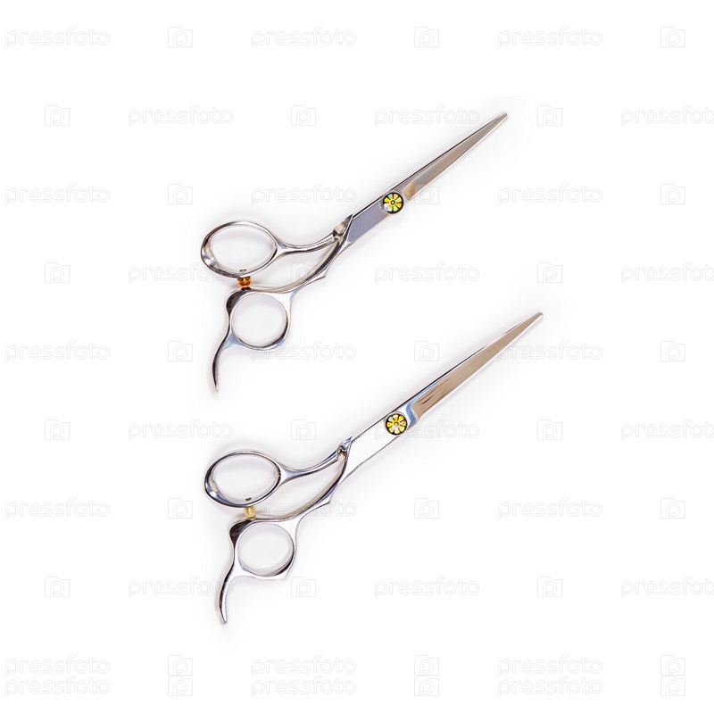 Набор парикмахерских инструментов из двух ножниц на белом фоне