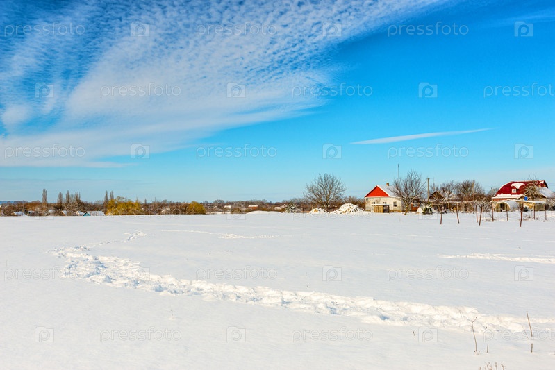 Сельский зимний пейзаж со свежим снегом