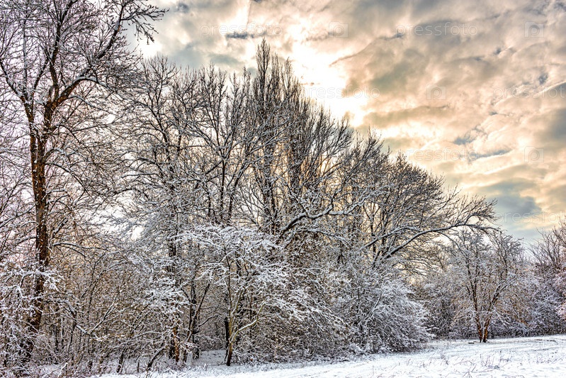 Зимний пейзаж опушки леса вечером