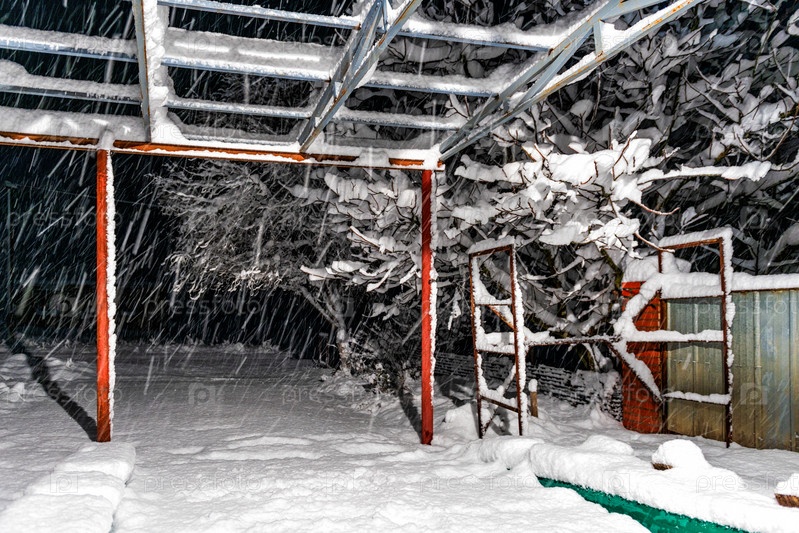 Зимний ночной пейзаж. Снег липкий, налипает на деревья и создает глубокие сугробы;