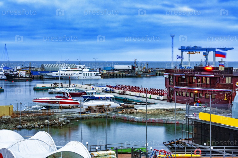 Морской порт малых судов зимой в пасмурную погоду вечером
