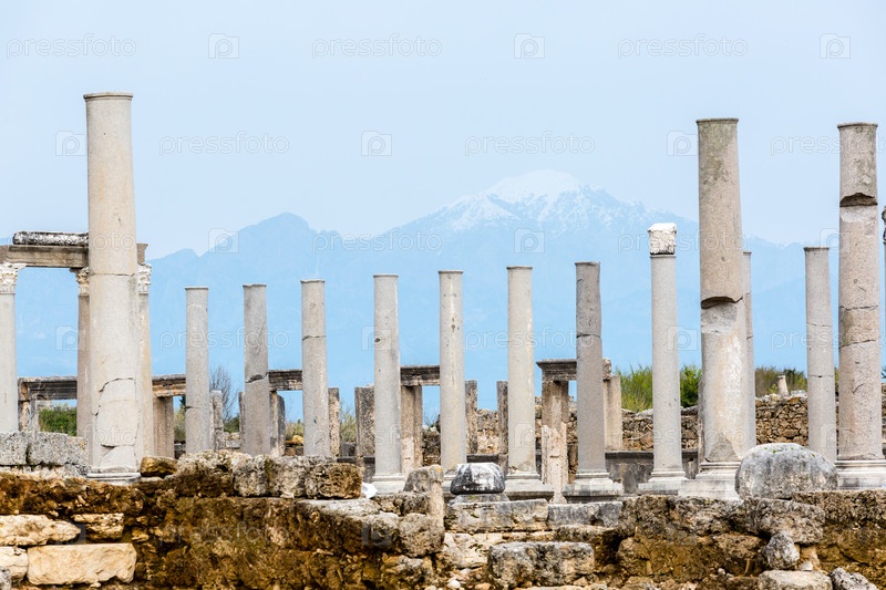 Мраморные колонны на фоне гор в древнем городе Перге недалеко от Анталии, Турция