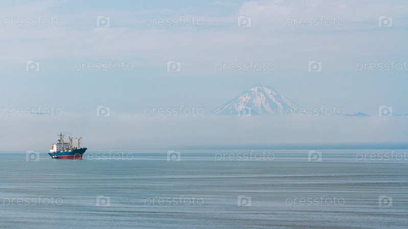 Корабль на фоне Вилючинского вулкана, Камчатка