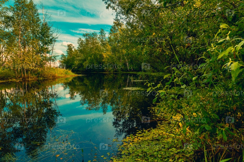 Лесная река с берегами заросшего небольшого леса лиственных пород в сентябре